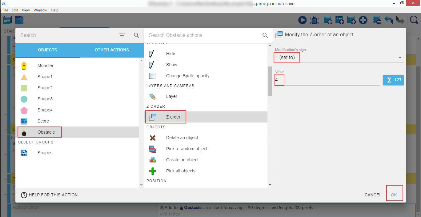We'll make sure the bomb is in front of the shapes, and not behind them - to do that, we're gonna use Z order. It's a way to tell the game how we want the objects to be rendered. "Obstacle", then "Z order", then = (set to) and 4.
